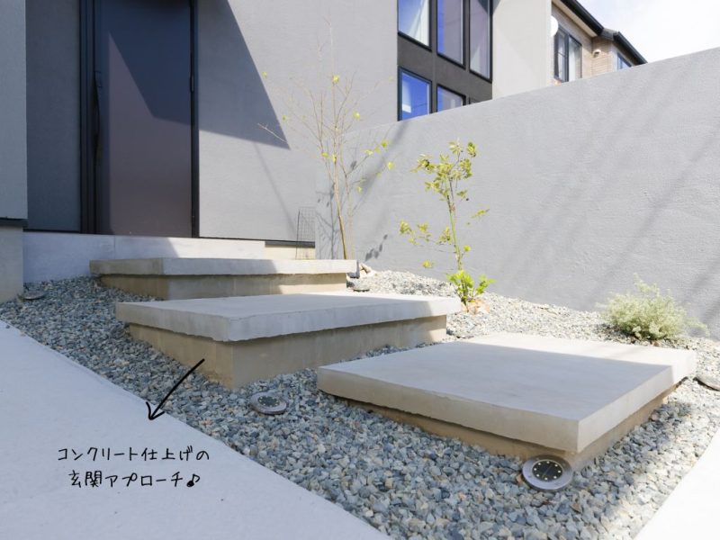 コンクリ―ト仕上げの玄関アプローチは、シンプルでモダンな印象に。